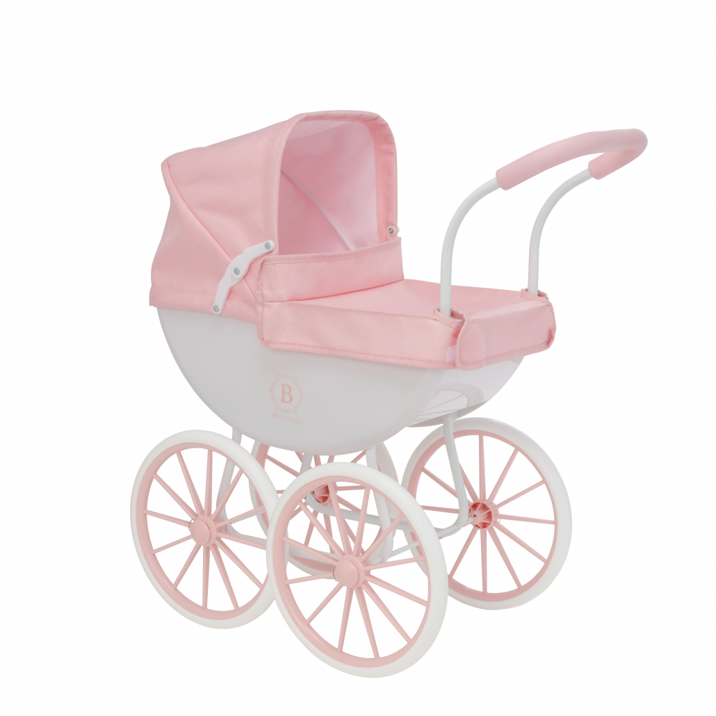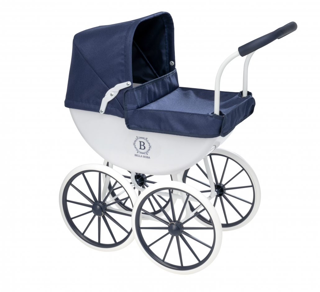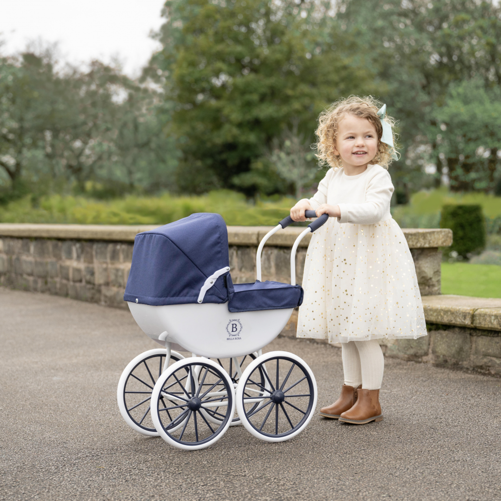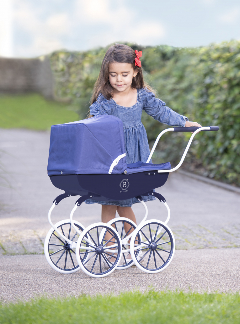 Featuring an adjustable canopy and removable apron, it is available in pink and navy and comes with matching pillow and bedding to keep baby dolls snug at naptime. Its traditional style encourages push and play baby doll games along with multifunctional role-play and imagination.